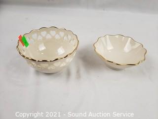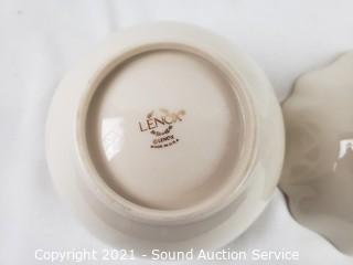 Lot Details: 3 teacups & saucers (Ainsley England, 22kg Limoges Castel France, Royal Albert Forget-Me-Not England), 2 Lenox dishes, and others.