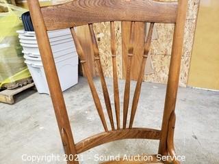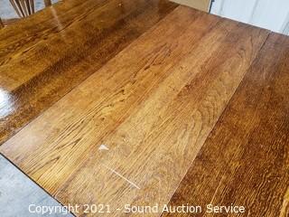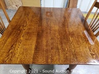Lot Details: 29" H x 42" x 42" with two 9" leaves. Chairs 42" H x 17.5" W x 17" to seat. Table top has some wear, refer to photos.