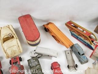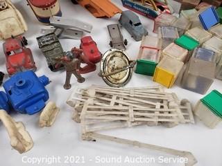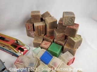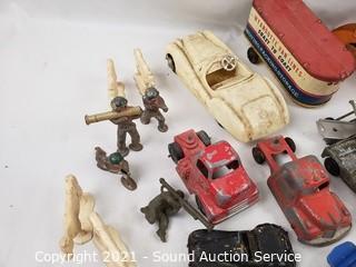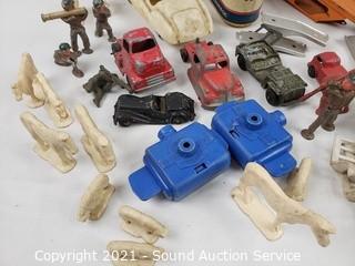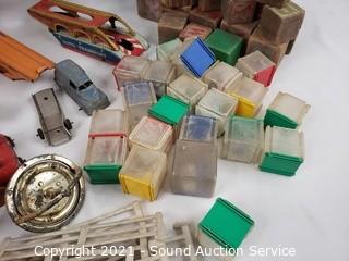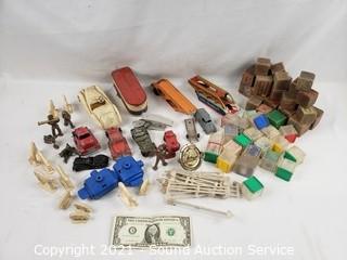 Lot Details: Wood blocks, die cast & plastic army men, tootsie toy die cast, tin cars & more.