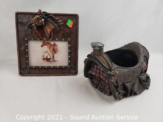 Lot Details: 14" H x 5.5" oil lamp, saddle bottle caddy, metal art cowboy & girl dancing, horse picture frame 4x6, miniature wood carriage.