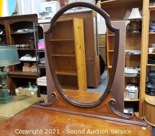 Lot Details: Matches the next lot. Shield mirror, dovetail joinery, wood casters. 65" H x 42" W x 19" D vanity, 18" H x 23" x 13.5" bench. Various wear to the finish.