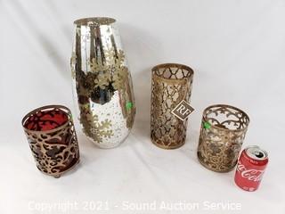 Lot #0323: 3 Hurricane Candleholders & Decorative Vase