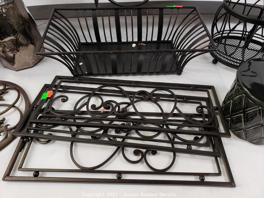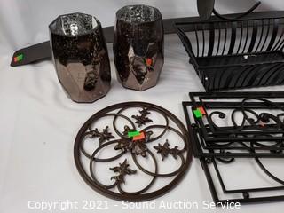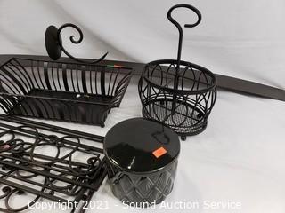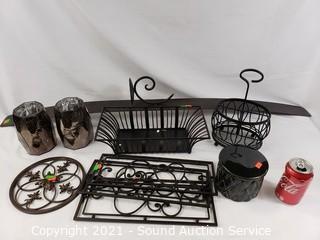 Lot Details: Includes condiment caddy, candleholders, wire basket, wall sconce candleholder, metal art wall decor.