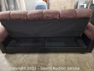 Lot Details: Folds down into a full size bed. Soft and comfortable, storage underneath. 36" x 84", 17" to seat as a sofa, 52" wide as a bed. In great condition.