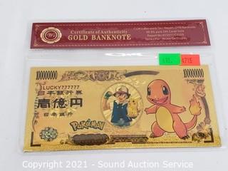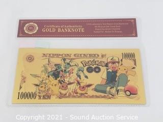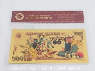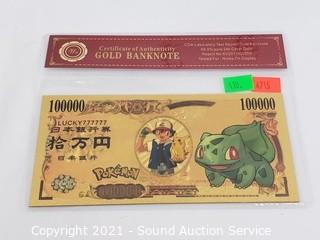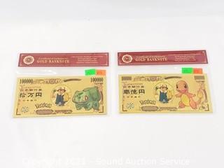 Lot #0410: 2 Pokemon 99.9% 24k Gold Banknotes w/COA