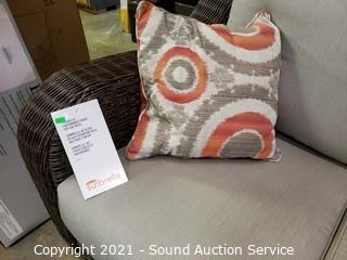 Lot Details: The rattan on the back has an indentation from shipping, otherwise like new. 35" H x 77" W x 35" D x 18" to seat. Comes with 2 throw pillows.