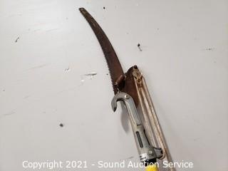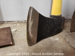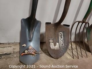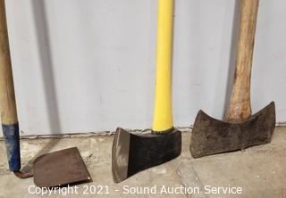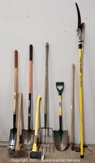 Lot Details: Spade shovels, hoe, trenching shovel, potato fork, tree pruner, axes.