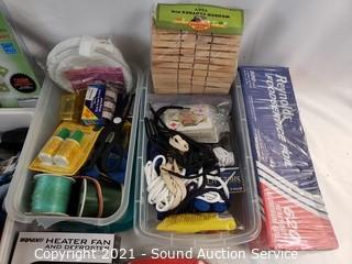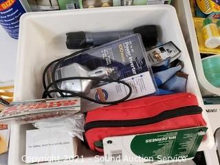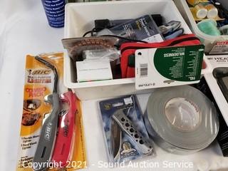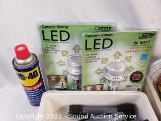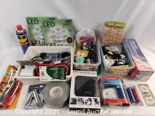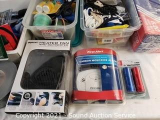 Lot Details: Tin foil, cloths pins, mini flashlights, LED bulbs, folding pocket knife, carbon monoxide alarm & more. Many like new.