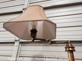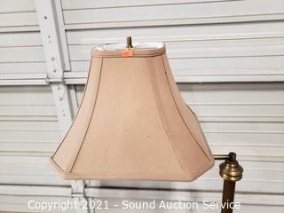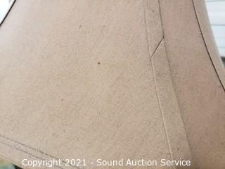 Lot Details: Works. 14.5" fabric shade, some wear, has a dent on the foot, refer to photos.