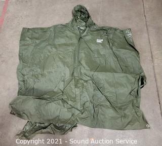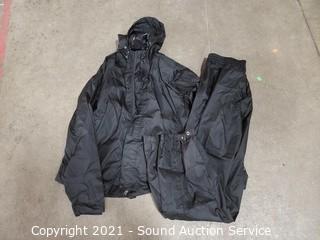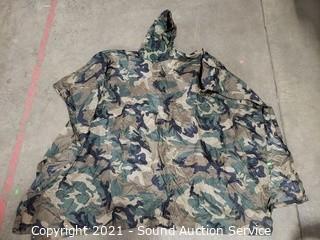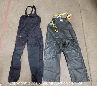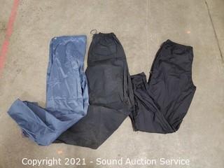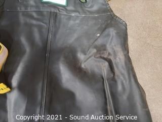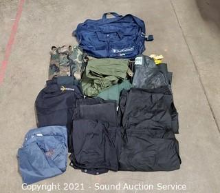 Lot Details: Includes Ozark Trail and other ponchos, pants size small, (2) medium and large, Guide Gear jacket size small, Moonstone waders size large, Helly Hanson waders size small and bucket hat.