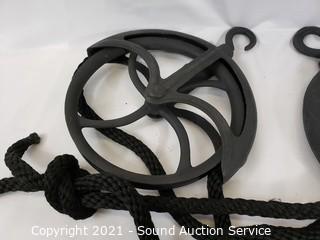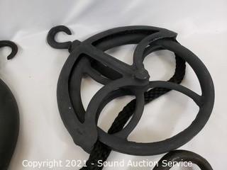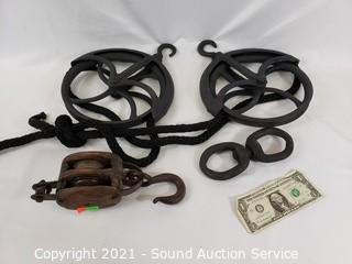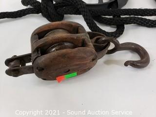Lot #0147: Vintage Wood Block 2" & Two Metal 9" Pulley's