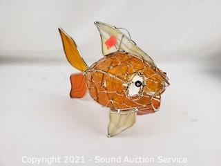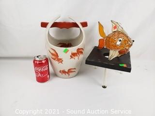 Lot Details: Stained glass 3D koi fish figure with stand, 6" x 3" x 8" and ceramic handled bucket, 12" x 7".