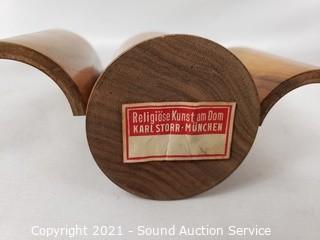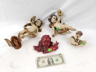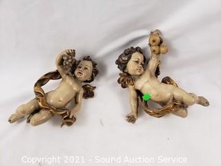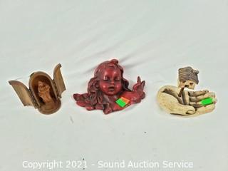 Lot Details: German wood Mother Mary sculpture, wax and composite cherubs, Broski signed pottery sculpture.