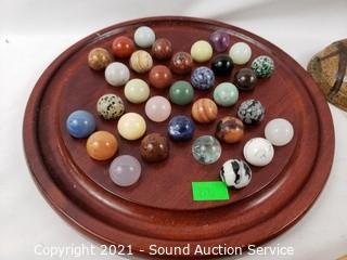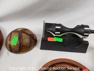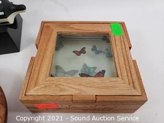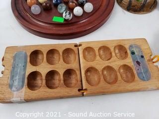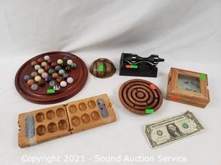 Lot Details: Includes levitating magnet desktop spinner, marble solitaire, puzzle, mancala, glass butterfly coasters and pottery wall pocket.