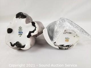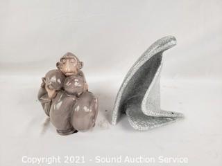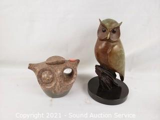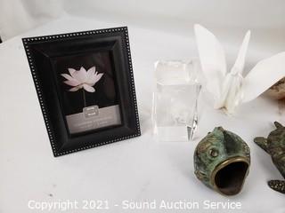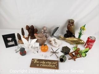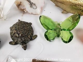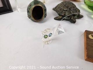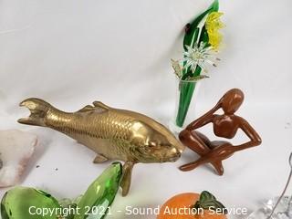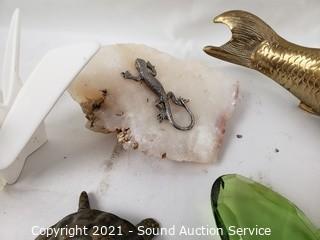 Lot Details: Includes art glass flowers, orange paperweight, quartz stone with gecko, Gesch brass turtle ash tray, brass koi fish, handcrafted pottery owl teapot, SPI solid brass owl sculpture, B&G Denmark porcelain monkey sculpture, Kotobuki carved stone sculpture and more.