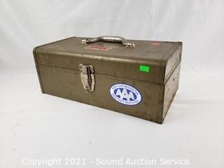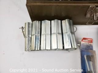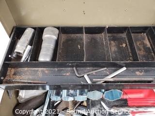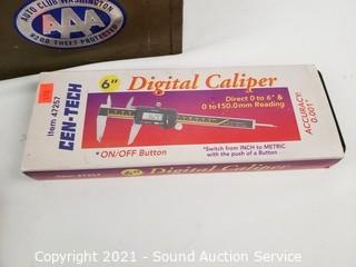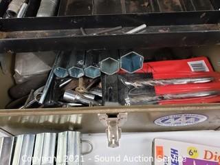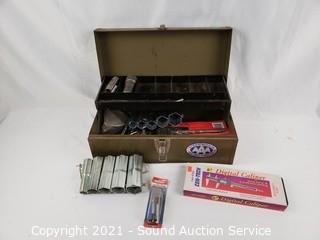 Lot Details: 6" Cen Tech digital caliper, sockets, C-clamps, drill bits, wrenches and more. 6" x 16" x 8" Park Model 83333 metal toolbox.