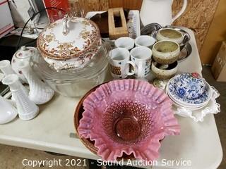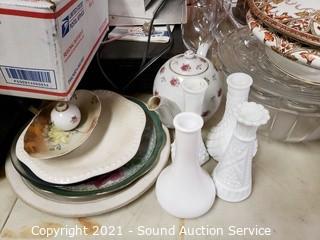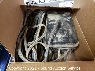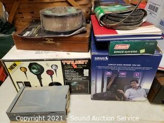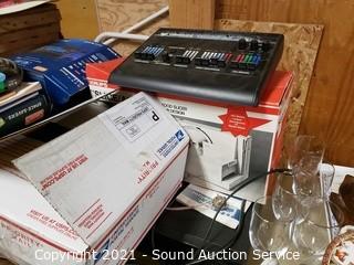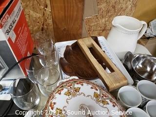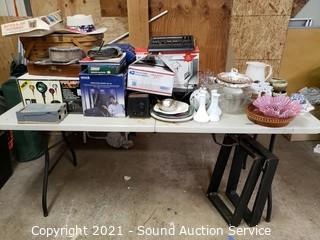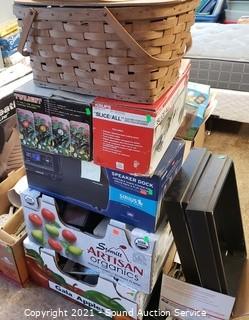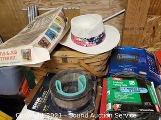 Lot Details: Includes; Space saver bags, various china, Sirius docking station (no power), woven baskets, straw hat, twilight stake lights, landscape lighting cable, video equalizer (untested), clear glass stemware, food slicer (no power) and more. Table NOT included.