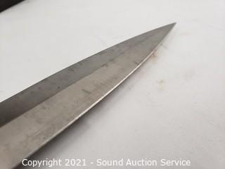 Lot Details: Comes with display. 15" long, 8.5" blade. 19.5" H x 8" W x 4" Display. Has a $269 second hand price tag on it.