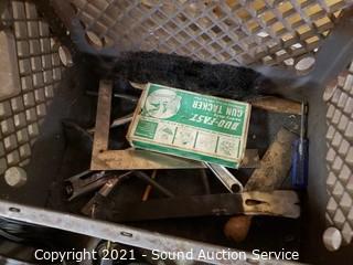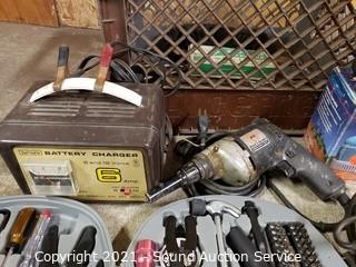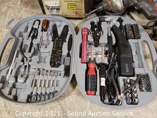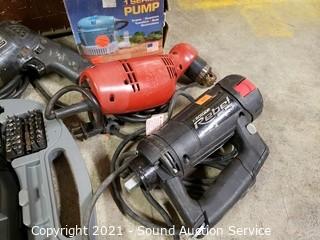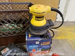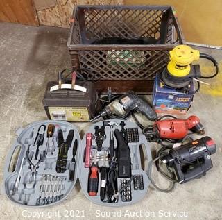 Lot Details: Milwaukee angle drill, water pump, Black & Decker drywall screw gun, DeWalt orbital sander, battery charger, Curtis vehicle tool kit (looks to be mostly complete), Roto-Zip tool, flat bar, & more. All power tools work.