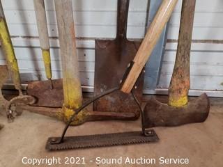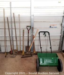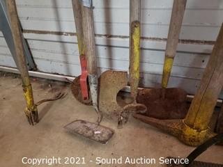 Lot Details: Weed puller, pickaxe, edger, double bit axe, scythe, hoe, seed spreader & more.