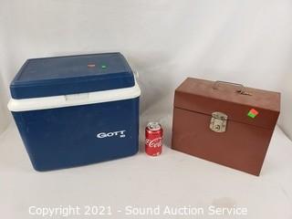 Lot Details: Largest tool box, 7" x 16" x 7". Cooler 13.5" x 15" x 11.5". File box is locking 10" H x 12.5" x 5.5"
