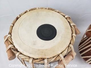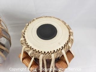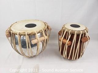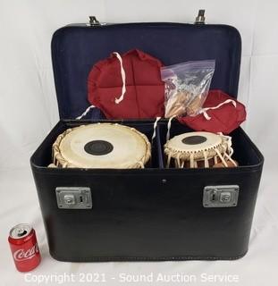 Lot Details: A tabla set is a pair of drums - one large and other small, played with hands. The higher-pitched drum, played with the right hand, is also called the dayan. It is a single-headed drum usually of wood and has two truncated cones bulging at the center. The bayan is played with the left hand and is smaller in size. Complete, comes with spare parts and case. Aluminum and wood.11" x 7" and 10.5" diameter. Case is 12" x 23" x 13".