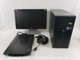 Lot Details: Intel Dual Core E2140 1.60ghz CPU, 512mb DDR2 667mhz RAM, 80gb HD, CD RW, HP 18" LCD VGA/DVI monitor, model HPw1858, Canon LiDE220 scanner. Works. Windows XP OS, password protected, needs wiped.
