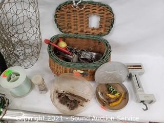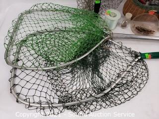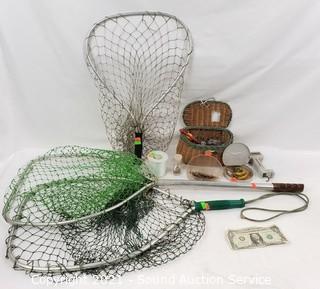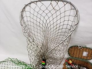 Lot #0238: Fishing Creel, 3 Nets & Accessories