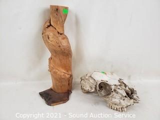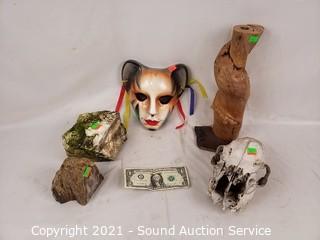 Lot #0354: Petrified Wood, Skull, Candle Holder & Mask
