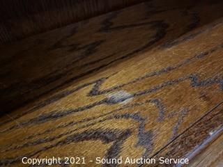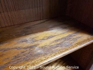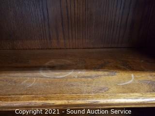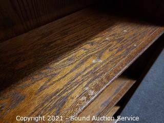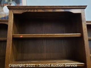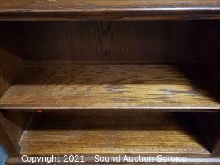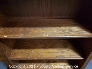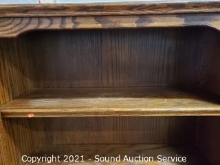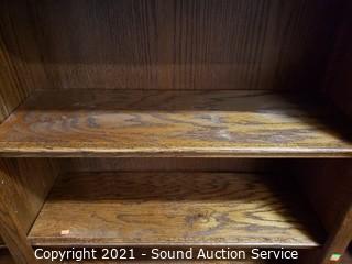 Lot Details: All the shelves are adjustable, some oak solids, some wear to the finish. 85" H x 33" W x 12" D.