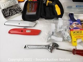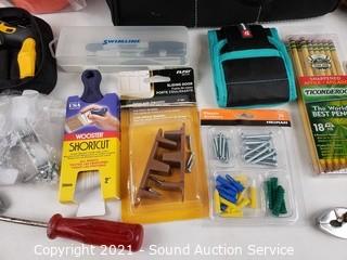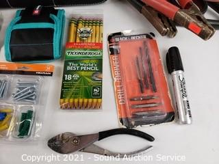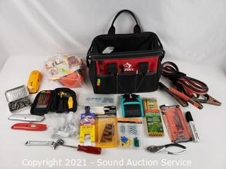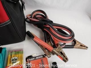 Lot Details: Jumper cables, drywall screw fasteners, stud finder, forearm forklift straps, razor knifes & more. 9" H x 8" x 11" bag.