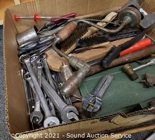 Lot Details: Wire brushes, wrenches, snips, ratchets & more.