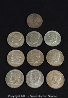Lot Details: (1) 1942 90% Silver Walking Liberty Half Dollar, (7) 1967 & 68 40% Silver Kennedy Half Dollars, (2) 1964 90% Silver Kennedy Half Dollars.