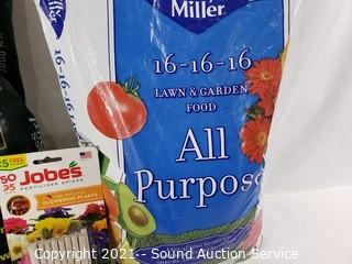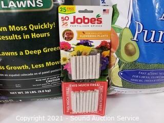 Lot Details: 20lb bag of plant food & moss out, & 50 Jobes fertilizer spikes. Plant food has been opened, looks full or mostly full.