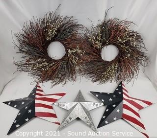 Lot Details: 15" to 18" metal stars, 22" wreathes.