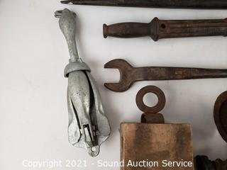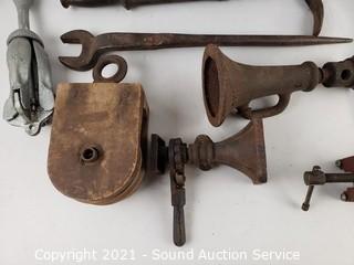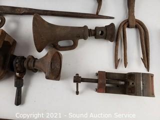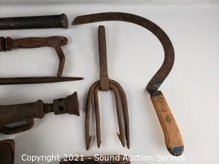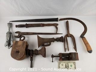 Lot Details: Grapple boat anchor, rustic spear tip, hand scythe, vise, screw jack, nail puller, wood block pulley.