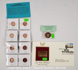 Lot Details: 2012 New Mexico Statehood 100th Anniversary gold stamp. 9 US Treasury medallions.
