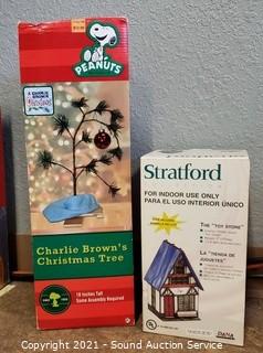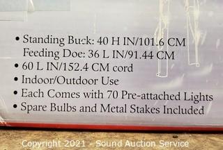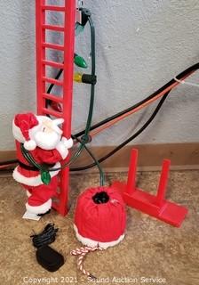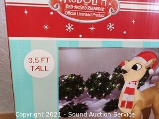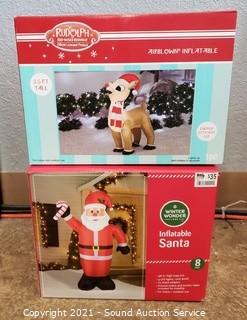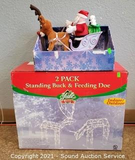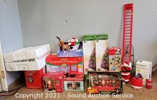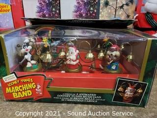 Lot Details: Animated, light & sounds. Inflatable Santa, inflatable Rudolph, Charlie Brown's Christmas tree, Looney Toons marching band, standing buck & feeding doe, 32" fiber optic trees, ladder climbing Santa, and more.
