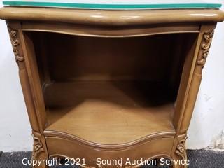 Lot Details: Matches the dresser in the previous lot. Comes with protective glass top, has a single drawer. Reveria Cherry, dovetail joinery. 28" H x 20 x 13.5".