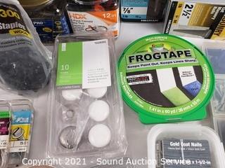 Lot Details: Brass hinge, frog tape, bungee cords, various screws, nails, drawer pulls & more.