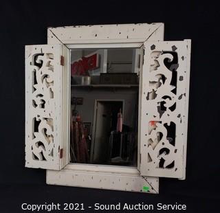 Lot Details: Scrolled doors cover the mirror. 24" x 17" mirror, 5.5" x 24" x 5" shelf.