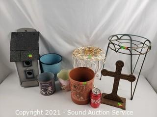 Lot #0309: Planter Pots, Stands, Birdhouse & Crucifix Decor