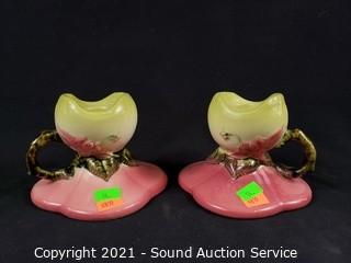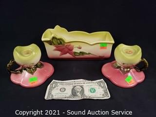 Lot #0094: 3pc Hull Woodland Candleholders & Planter