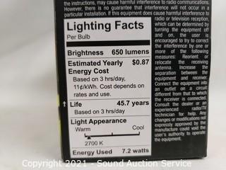 Lot Details: 7.2w, 650lm, 2700k color. Come with standard base adapters. All like new, work.