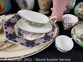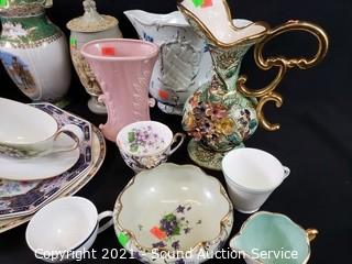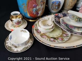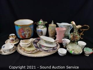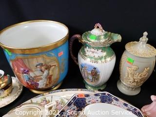 Lot Details: Belgium Pitcher, Victoria Austria pitcher, Victorian scene planter, teacups, creamers, platter & more.