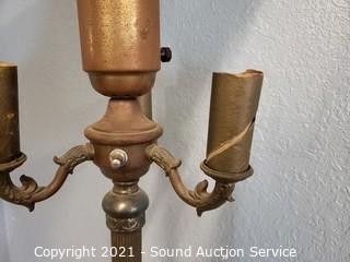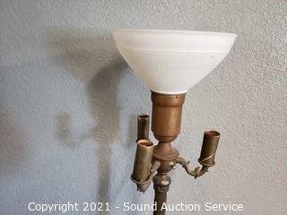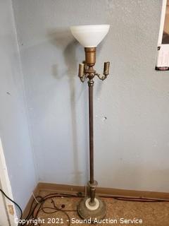 Lot Details: Milk glass shade. 3 side lights work take standard bulbs, center light is untested takes a large bulb. Various wear, refer to photos for condition. Part of the base is bent. 63" H x 8.5" Dia.