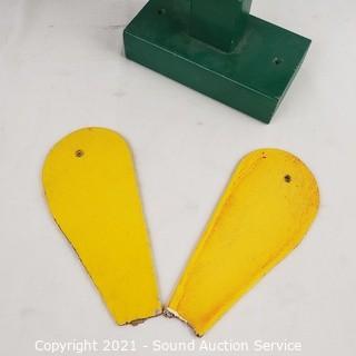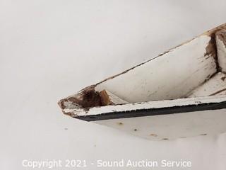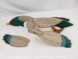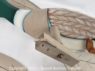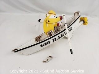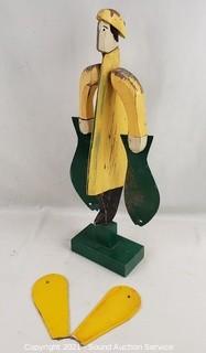 Lot Details: Duck Flapping its wings 23" L x 23" wings, one wing is broke, Sailor rowing boat, missing blade for pinwheel, 2 are not attached. & fisherman holding fish. 4" x 18" x 12" crate.