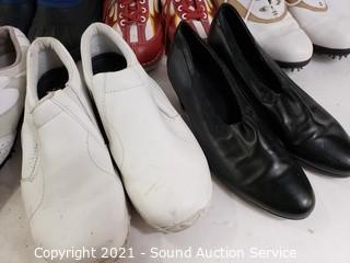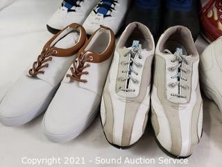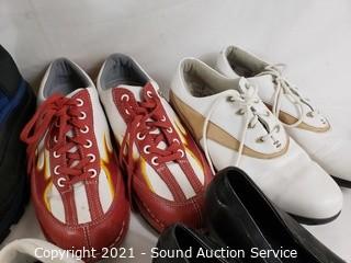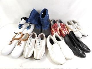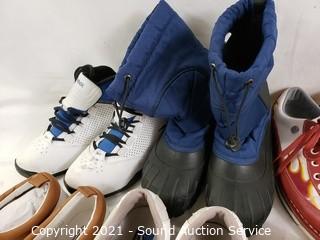 Lot Details: Cold weather boots S: 4, Reebok S: 5.5, Merrell S: 9.5, Footjoy S: 9.5, Soso S: 7.5, Etonic bowling shoes.