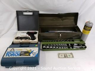 Lot #0144: Solder Gun, Sockets, Gas Torch, Ratchets, Wrenches