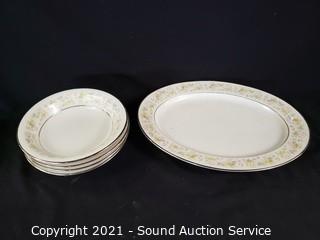 Lot Details: Complete service for 4 Wedgwood Ashford dish set. Noritake plates, bowls, platter & server.